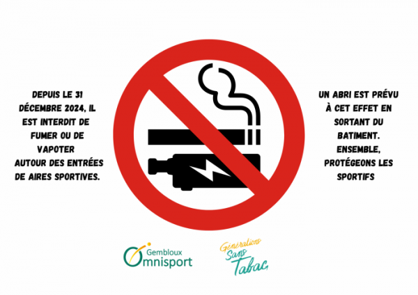 Depuis le 31 décembre 2024, il est interdit de fumer ou de vapoter dans un rayon de 10m autour des entrées des aires sportives. Des panneaux ont fleuris sur nos sites. Merci à tous d’y veiller afin de protéger les sportifs et le public